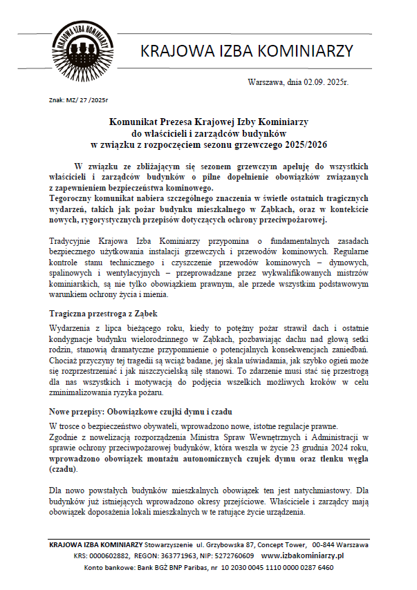 Poniżej załączamy dla Państwa komunikat Prezesa Krajowej Izby Kominiarzy do właścicieli i zarządców budynków, w którym poruszane są bardzo ważne tematy tj. obowiązku montażu czujek dymu i czadu oraz poprawnej formy protokołu sprawdzenia stanu technicznego przewodów kominowych.